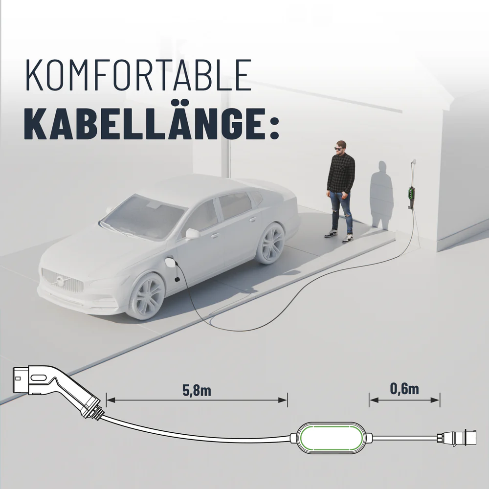 • TASCHE – Dank der großen Tasche kann die 6,4 Meter lange 11kW mobile Ladestation 16A schnell und einfach verstaut und transportiert werden